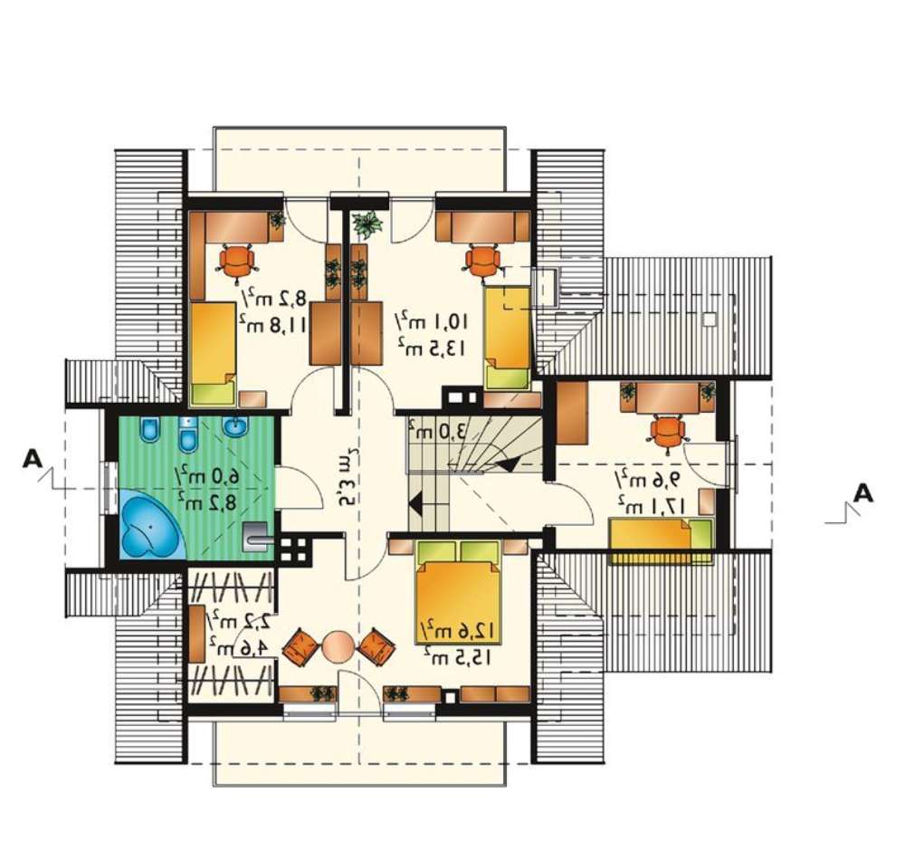 Под личные апартаменты отдан второй этаж. Четыре компактные спальни имеют достаточные площади для размещения всей потребной меблировки и техники. Три комнаты выгодно выделены наличием балкона. Такие преимущества предпочитают романтики и мечтательно настроенные особы, любящие наблюдать за закатами и рассветами.