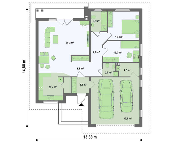 • 4M530 Большой одноэтажный дом с гаражом для двух авто