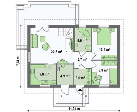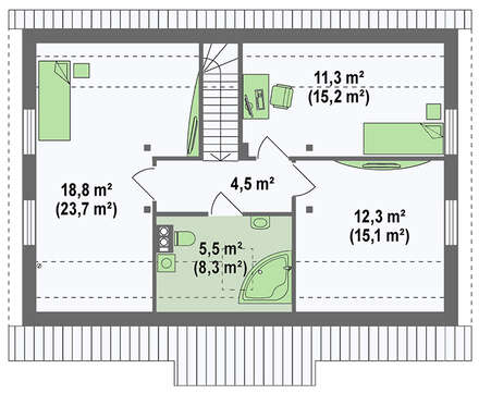 Проект содержит три раздела – Архитектурный, Конструктивный и Инженерный: водоснабжение, отопление, вентиляция, канализация, электроснабжение (приобретается за дополнительную плату) + Пояснительная записка.