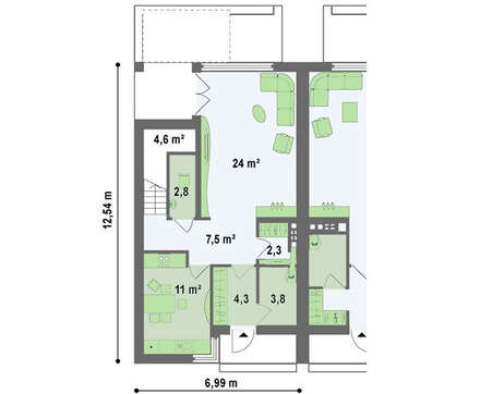 Проект содержит три раздела – Архитектурный, Конструктивный и Инженерный: водоснабжение, отопление, вентиляция, канализация, электроснабжение (приобретается за дополнительную плату) + Пояснительная записка.