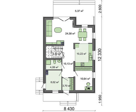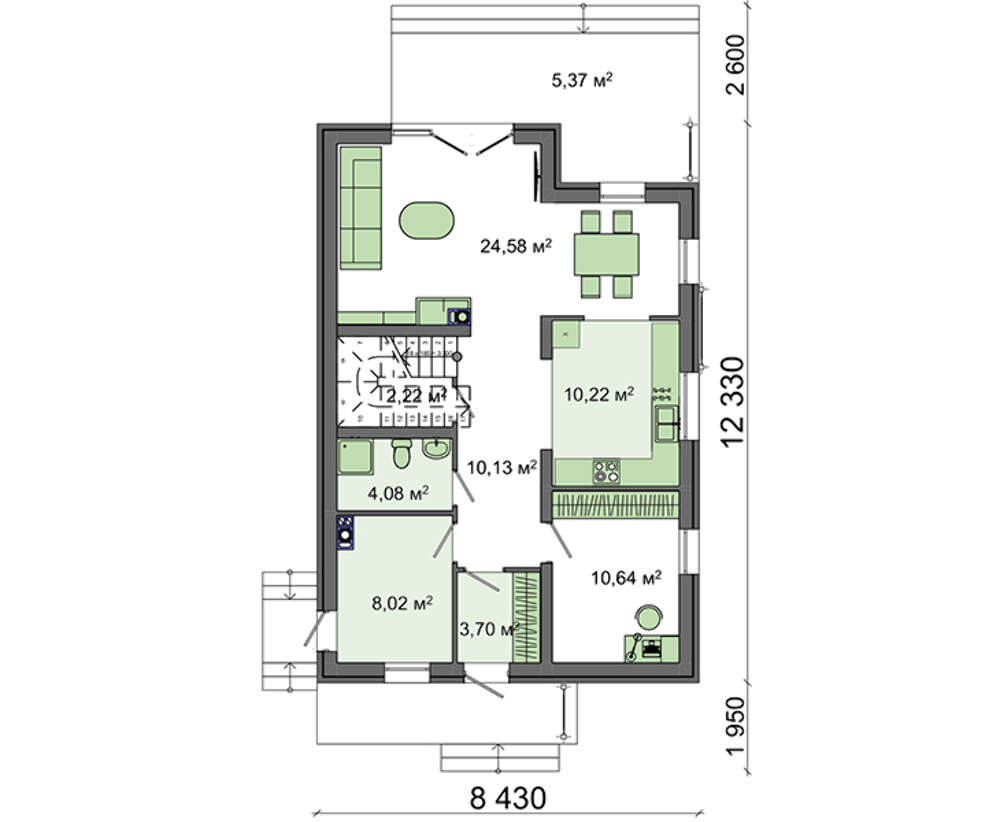 Первый этаж включает помещения разного назначения. Небольшая спальня станет уютным гнездышком для членов семьи старшего поколения или с людей ограниченными возможностями. Студия включает гостиную, столовую и кухню. Уникальная Г-образная форма позволила отделить место для приготовления пищи от зоны отдыха, даст возможность хозяйке дома без постороннего вмешательства готовить потрясающего вкуса блюда.