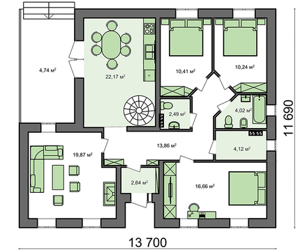 Проект содержит три раздела – Архитектурный, Конструктивный и Инженерный: водоснабжение, отопление, вентиляция, канализация, электроснабжение (приобретается за дополнительную плату) + Пояснительная записка.