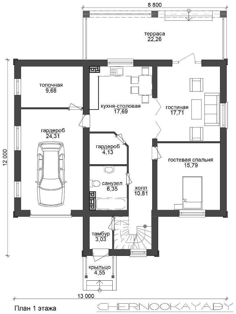 Проект содержит три раздела – АрхитектурныйКонструктивный и Инженерный: водоснабжение, отопление, вентиляция, канализация, электроснабжение (приобретается за дополнительную плату) + Пояснительная записка.
