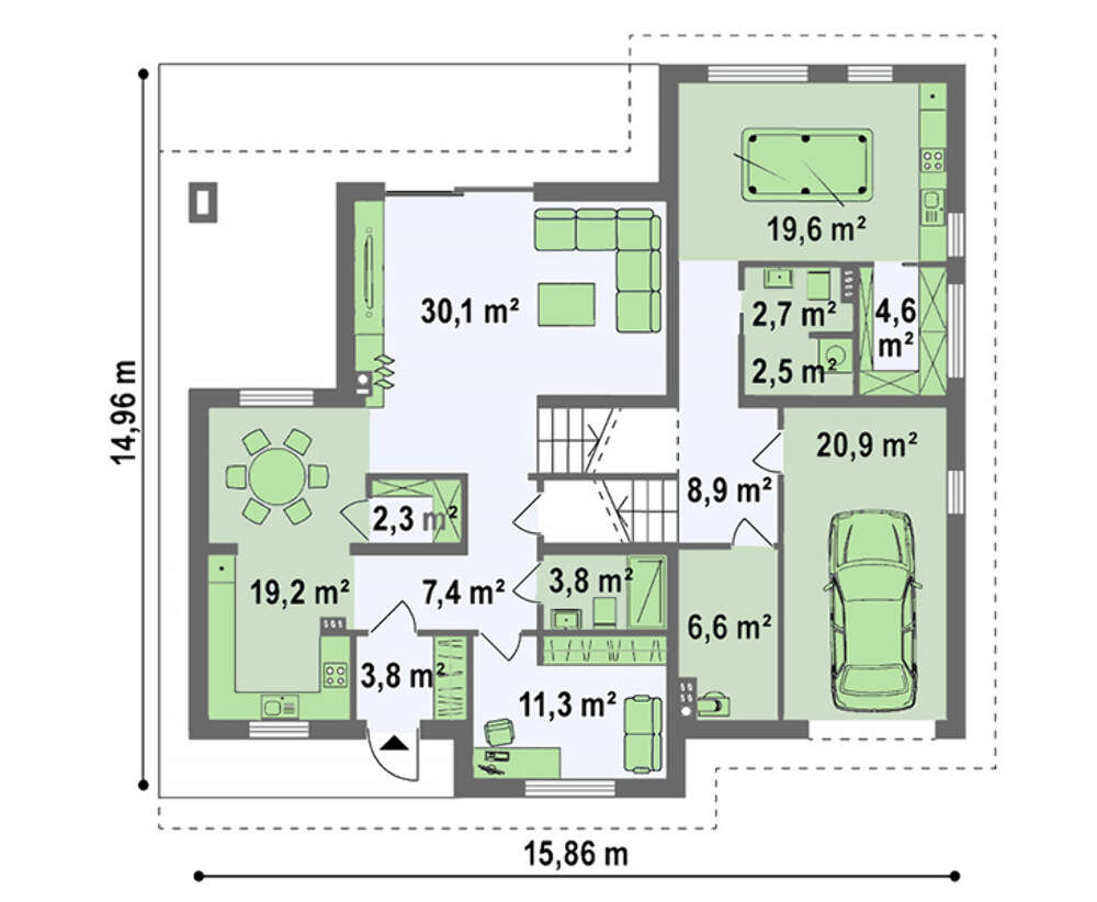 Особенность строения в необычной планировке. Первый этаж имеет многоплановый характер, его помещения используются для разных целей. Место приема друзей условно разделено на две зоны: гостиную и кухню со столовой. Такая планировка помогает отделить место отдыха от точки приема пищи, что удобно. Размещенный в цокольном этаже гараж в свои размеры включает мастерскую для сервисного обслуживания транспорта и позволяет все работы автолюбителю выполнять в комфортных условиях.