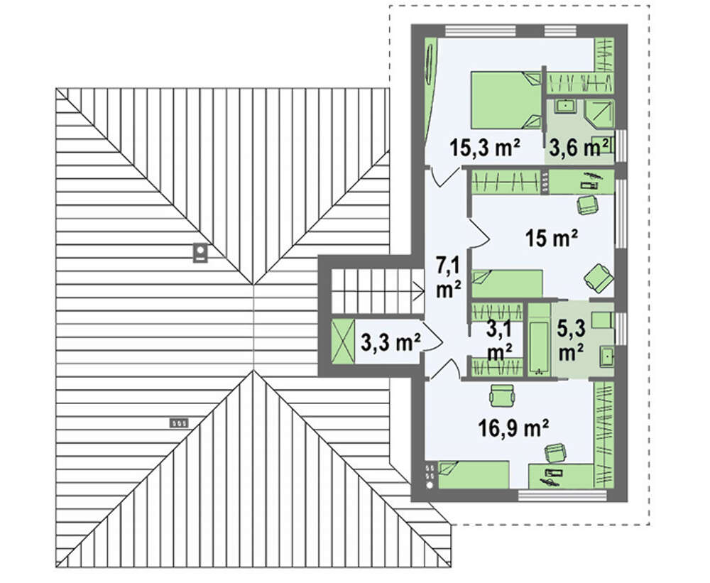 На втором этаже имеются спальные помещения, их предусмотрено три. Разнятся необычной планировкой, включают санудобства, одна из комнат охватывает личную гардеробную.