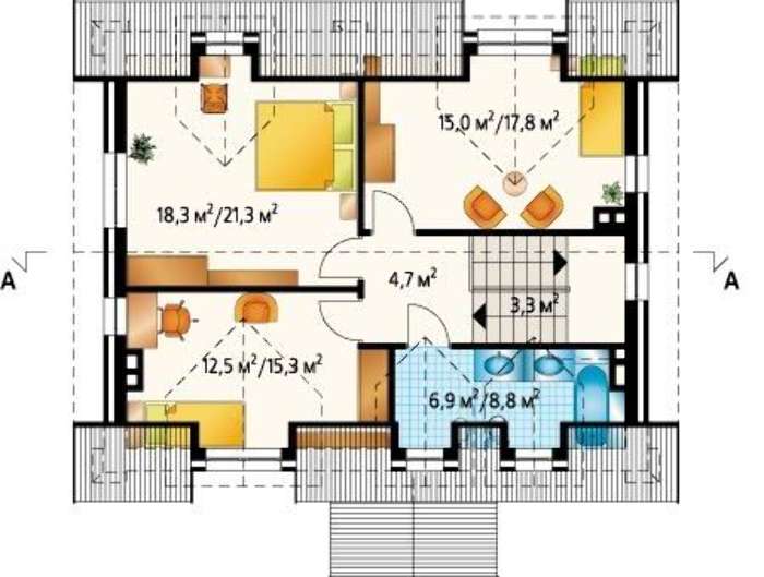 Отдыхать и заниматься личными делами в этом доме предполагается на втором этаже. Три достаточного размера спальных помещения благодаря своей компактной планировке рассчитаны на размещение всей требуемой мебели и техники.