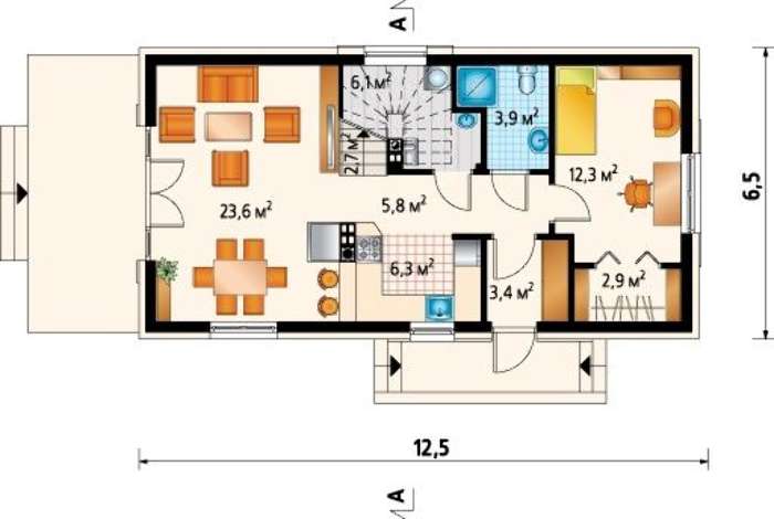 Узкое строение отлично позволяет изолировать помещения за счет планировки. Гостиное определено в торцевое место, включает в себя столовую, отделено от кухонного пространства, но максимально приближено к нему. Такое расположение позволяет хозяйке независимо кухарничать смачные яства. Для удобства времяпрепровождения приятелей предусмотрен отдельный выход на загородный простор прямо из гостиной. Имеется возможность в хорошую погоду на свежий воздух перенести задушевные беседы и наслаждаться дарованной частным домом свободой.