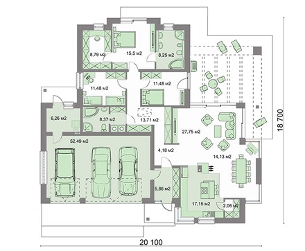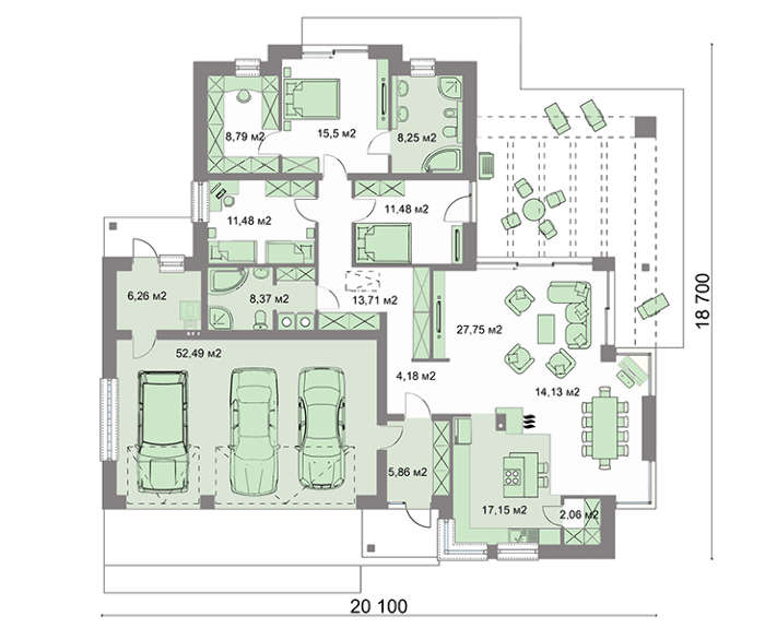 Одноэтажный жилой дом с гаражом на три автомобиля