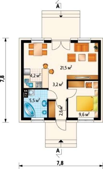 Для того чтобы получить максимальную площадь для отдыха и проживания внутреннее пространство рационально разделено. Небольшая комната выполнена уединенно и позволяет хозяевам максимально отдохнуть в тишине и покое. Комфортное временное проживание обеспечивает кухонное, столовое и гостиное пространство, которое объединено в единое целое. Здесь найдется место для приготовления пищи, вкусных обедов и ужинов, а также приема друзей, которые любят неожиданно нагрянуть в гости на загородное пространство.