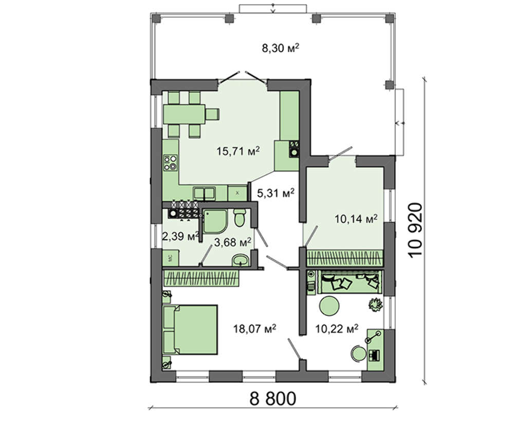 • 4M700 План дома для сезонного проживания среднестатистической семьи общей площадью 73 кв. м, жилой 28 кв. м