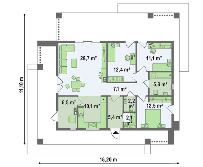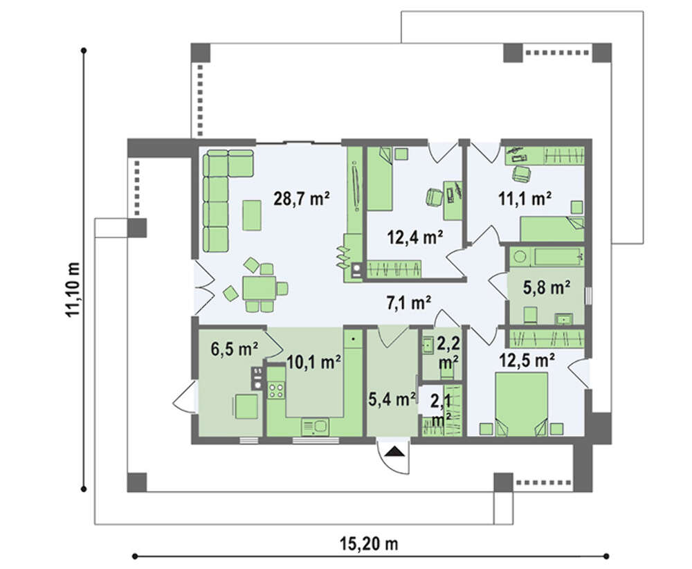 План компактного дома на 103 кв. м для небольшого узкого участка