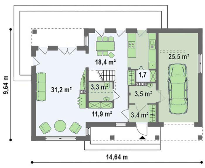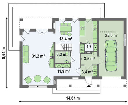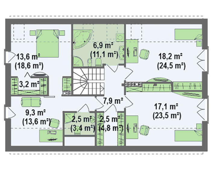Проект 1,5-этажного дома с 3-я спальнями на втором этаже