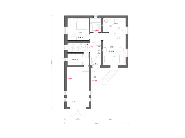 Проект содержит три раздела – Архитектурный, Конструктивный и Инженерный: водоснабжение, отопление, вентиляция, канализация, электроснабжение (приобретается за дополнительную плату) + Пояснительная записка.