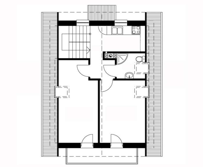Проект содержит три раздела – Архитектурный, Конструктивный и Инженерный: водоснабжение, отопление, вентиляция, канализация, электроснабжение (приобретается за дополнительную плату) + Пояснительная записка.