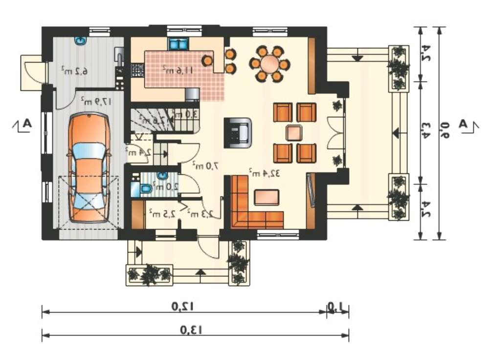Пространство первого этажа рассчитано на проживание водителя — автолюбителя, в его площади предусмотрено место под гараж и мастерскую для хранения инструмента. Все основное внимание при разделении помещения уделено зоне приема гостей, ей определена большая часть площади, увеличенная за счет слияния с кухней и столовой. Отнесение кухонного в угловую часть помогает хозяйке готовить блюда в частичной изоляции, без постороннего навязчивого участия. Выход из гостиной на приусадебный участок вносит разнообразие в дружеские приемы, передвигая часть встречи на загородный простор.