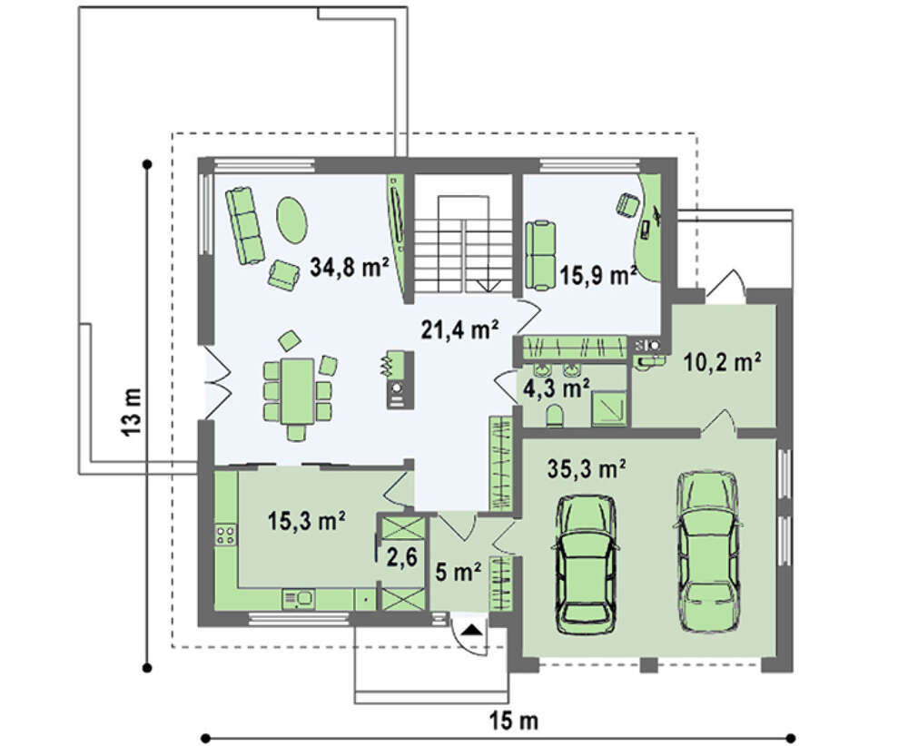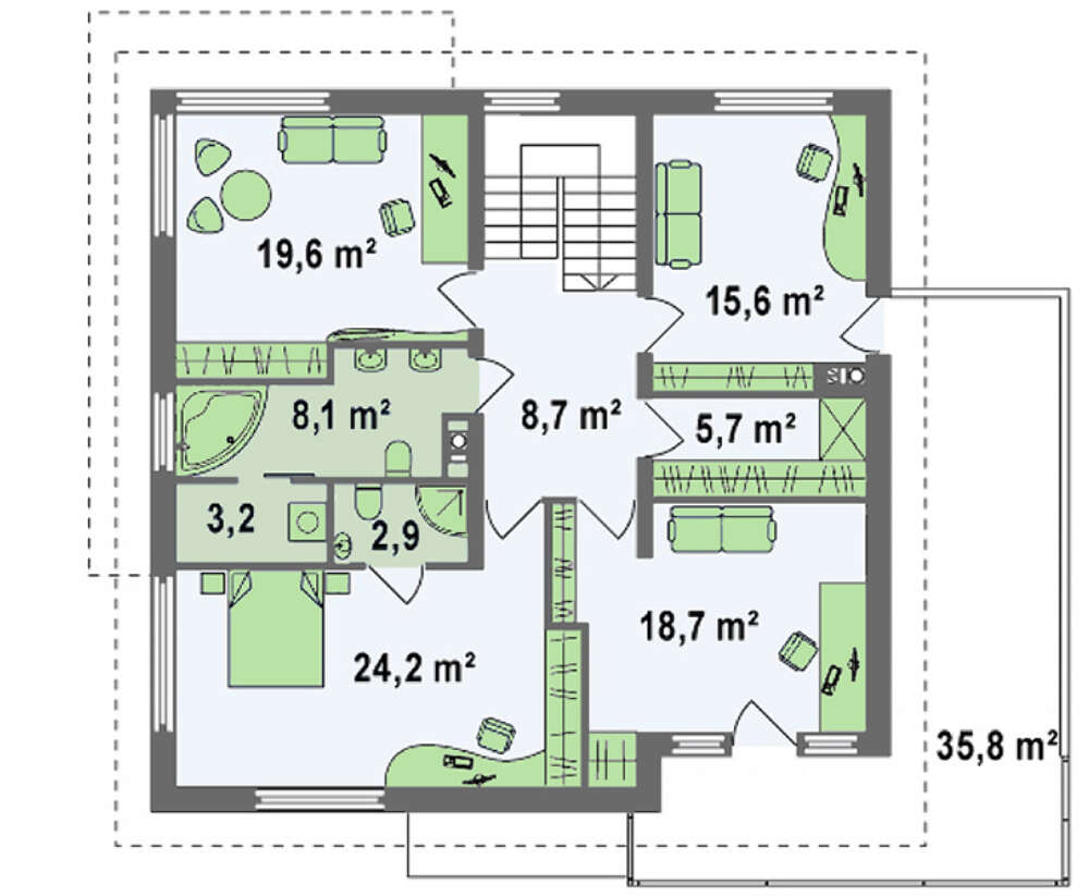 Проект двухэтажного коттеджа с застекленным балконом над гаражом