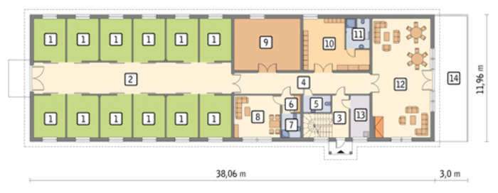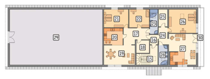 Проект содержит три раздела – Архитектурный, Конструктивный и Инженерный: водоснабжение, отопление, вентиляция, канализация, электроснабжение (приобретается за дополнительную плату) + Пояснительная записка.