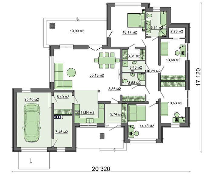 Проект эксклюзивного одноэтажного коттеджа с гаражом общей площадью 195 кв. м, жилой 95 кв. м 4M809