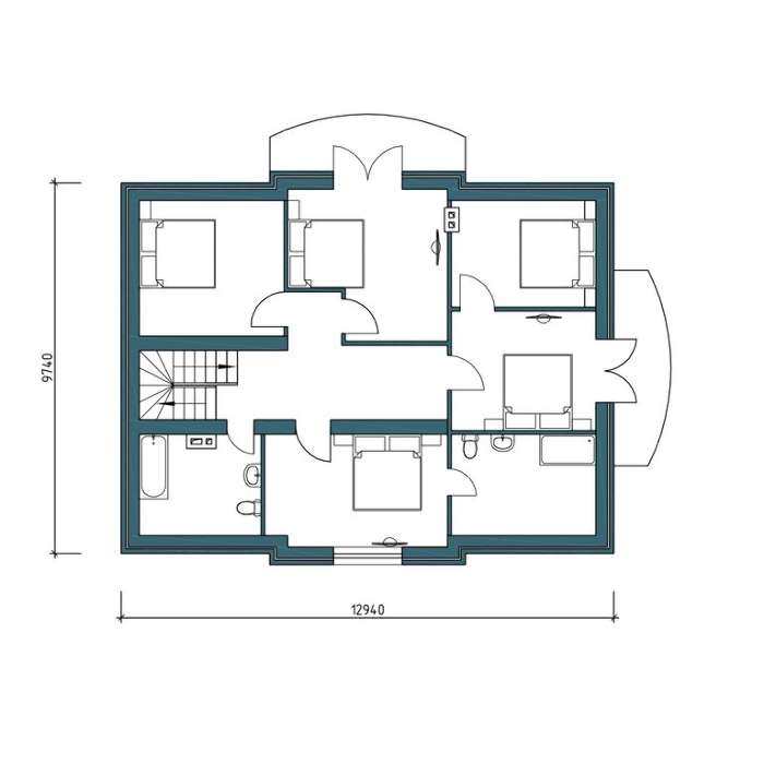 Четырех санитарных комнат будет вполне достаточно для свершения естественных потребностей многочисленных обитателей. А красивые балкончики в белом обрамлении поспособствуют созданию романтического настроения для наблюдения за закатом.
