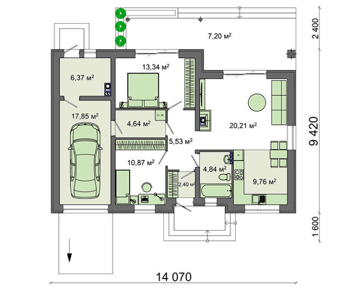 Проект содержит три раздела – АрхитектурныйКонструктивный и Инженерный: водоснабжение, отопление, вентиляция, канализация, электроснабжение (приобретается за дополнительную плату) + Пояснительная записка.