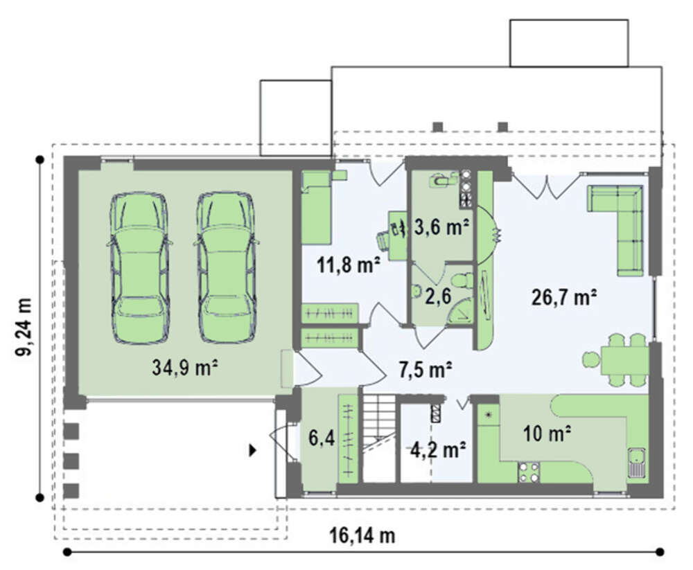 Проект коттеджа с двускатной кровлей и гаражом для 2х авто