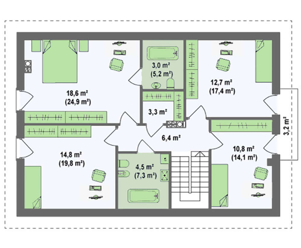 Проект содержит три раздела – Архитектурный, Конструктивный и Инженерный: водоснабжение, отопление, вентиляция, канализация, электроснабжение (приобретается за дополнительную плату) + Пояснительная записка.