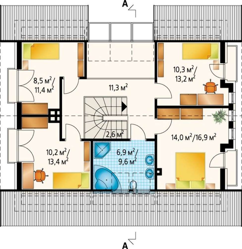 Проект коттеджа с мансардой в традиционном стиле площадью 170 m²
