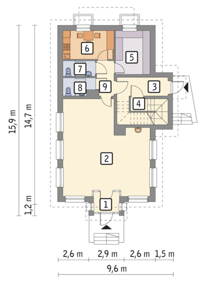 Проект содержит три раздела – АрхитектурныйКонструктивный и Инженерный: водоснабжение, отопление, вентиляция, канализация, электроснабжение (приобретается за дополнительную плату) + Пояснительная записка.