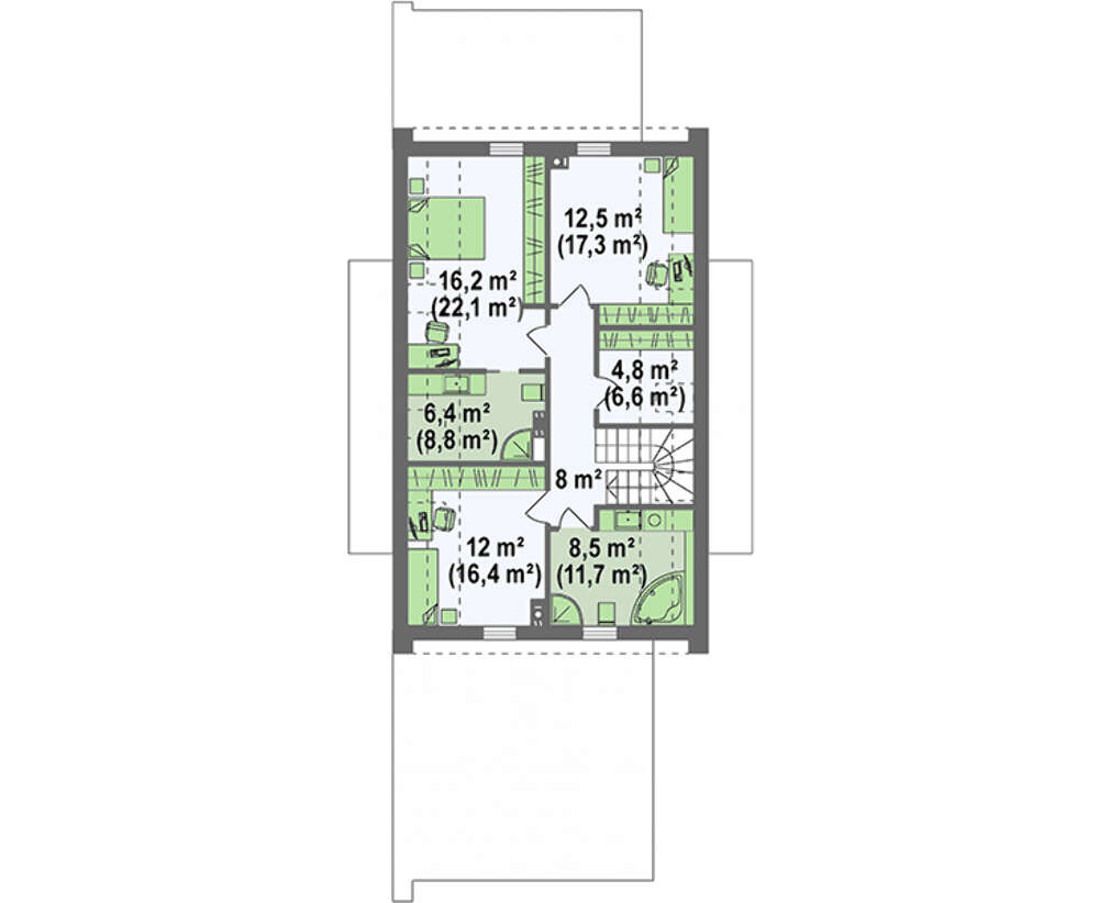 Полноценному отдыху и расслаблению способствует верхний этаж строения, включающий только апартаменты для сна и санитарную зону. Они отличаются по размерам и форме, что позволяет каждому жильцу выбрать наиболее понравившееся. Одно из помещений выделено уровнем благоустройства, который увеличен за счет личной санитарной комнаты.