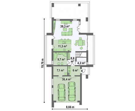 Открытый характер и современный вид получены за счет наличия больших, на всю высоту комнаты окон и значительной по размерам террасы, помещающий столики, стульчики и большие шезлонги. Просторы коттеджа рассчитаны на размещение широкого гаража, включающего два авто и мастерскую, где можно с комфортом выполнить их обслуживание.