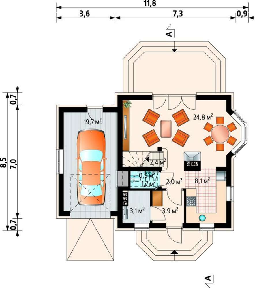 После расположенного внутри первого этажа гаража, остается достаточно места для размещения гостевой зоны, размеры которой рассчитаны на большое количество друзей и родственников. Благодаря рационально выполненной планировке зона кухни максимально отнесена в угол, что защищает жилое пространство от надоедливых запахов.
