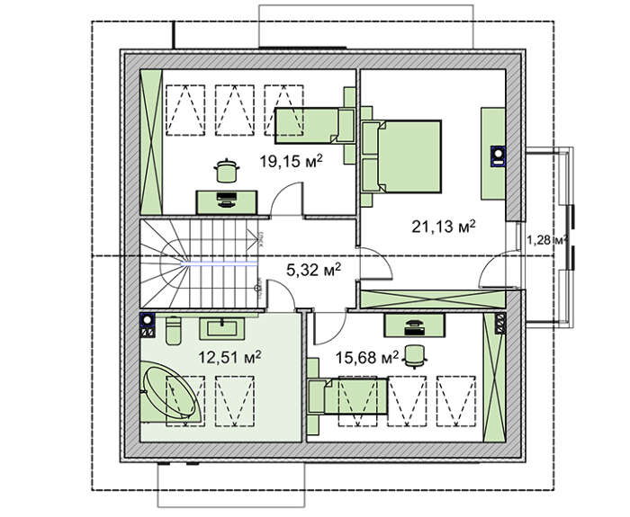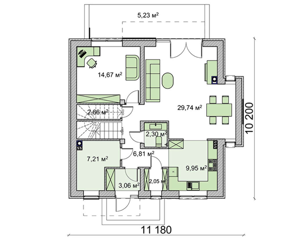 Проект содержит три раздела – АрхитектурныйКонструктивный и Инженерный: водоснабжение, отопление, вентиляция, канализация, электроснабжение (приобретается за дополнительную плату) + Пояснительная записка.