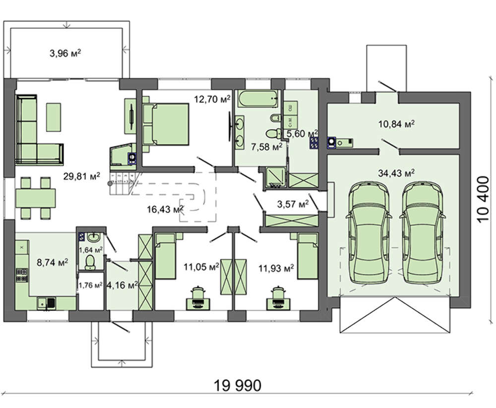 Несмотря на то что все жилые помещения представлены на одном уровне, четкое разделение пространства на зону отдыха, приема гостей и техническую позволяет жильцам отдыхать, принимать гостей и заниматься хозяйственными делами не мешая друг другу. Просторный гараж удивит и порадует мобильных членов семьи. Его пространство рассчитано на две единицы автотехники. Примыкающая мастерская позволит хранить комплект запчастей и выполнять хозяйственные работы в комфортных условиях.