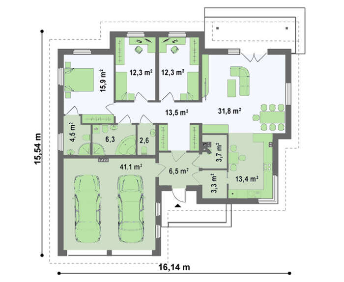 • 4M124 Проект одноэтажного дома с кирпичным фасадом и с гаражом для двух авто