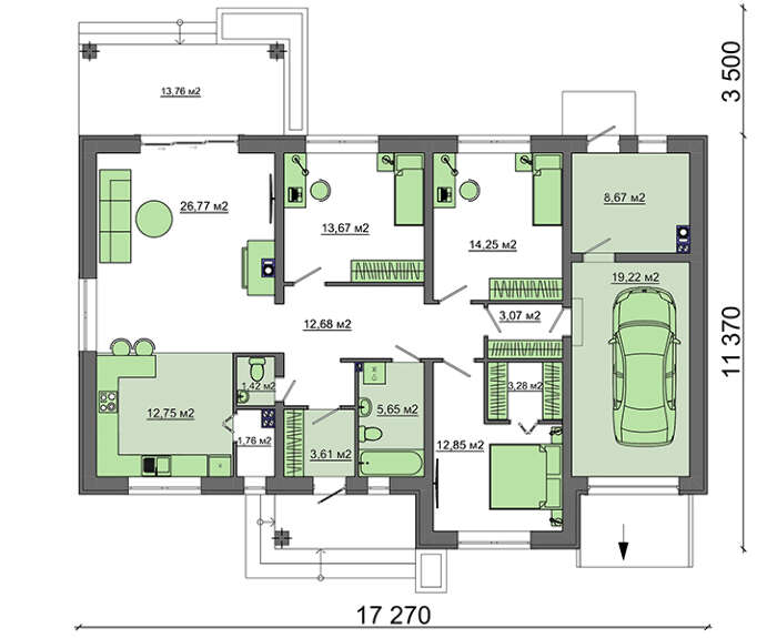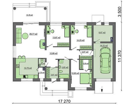 Планировка дома выполнена в европейском стиле. Здесь нет просторных холлов, каждый метр площади имеет свое назначение, только небольшой коридор  служит для обеспечения доступа к отдельным помещениям.