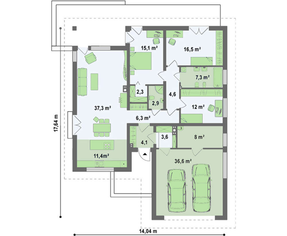 Проект одноэтажного коттеджа с гаражом для 2-х машин