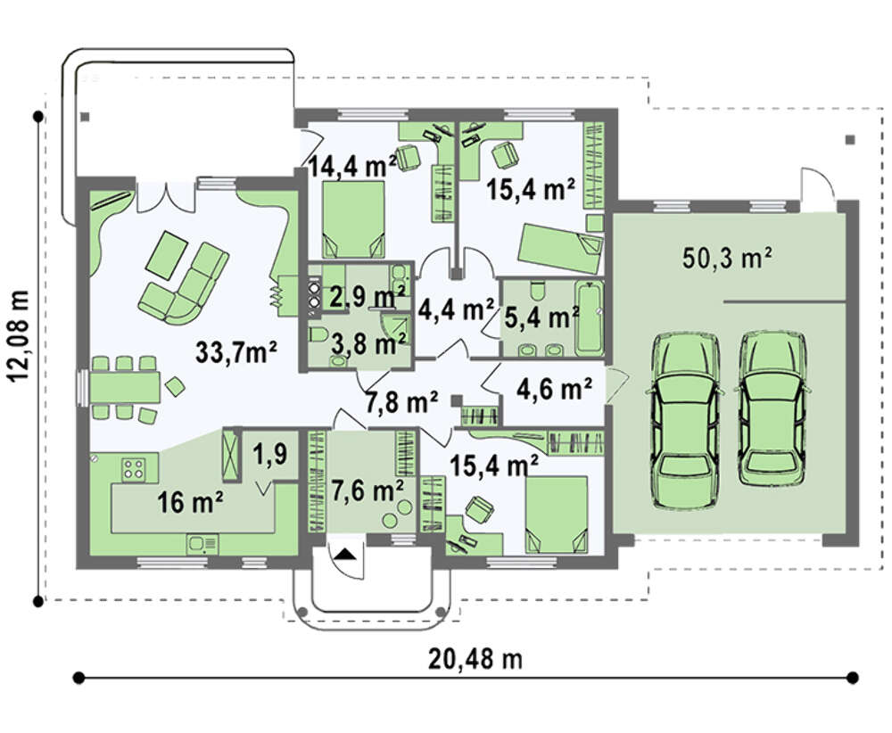 Проект одноэтажного коттеджа с гаражом в классическом стиле