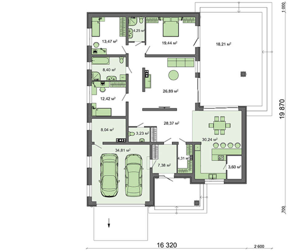 • 4M579 Проект одноэтажного коттеджа в европейском стиле с гаражом