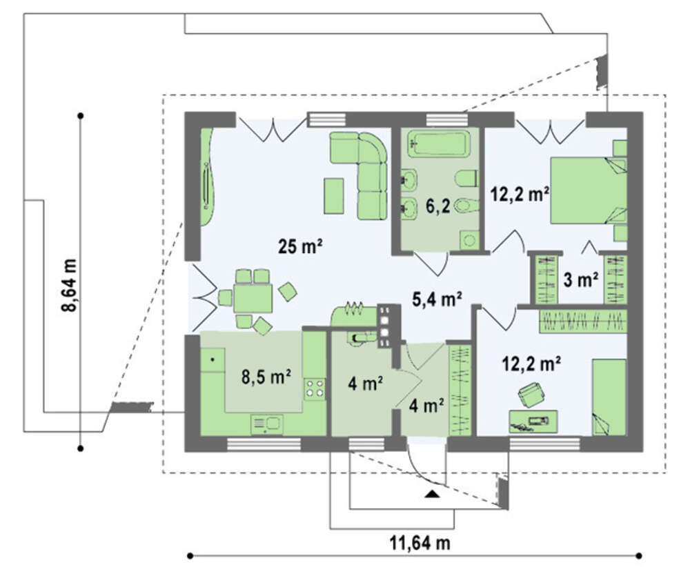 Проект содержит три раздела – Архитектурный, Конструктивный и Инженерный: водоснабжение, отопление, вентиляция, канализация, электроснабжение (приобретается за дополнительную плату) + Пояснительная записка.