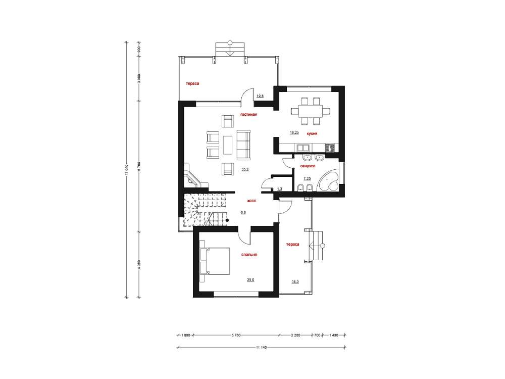 Проект содержит три раздела – Архитектурный, Конструктивный и Инженерный: водоснабжение, отопление, вентиляция, канализация, электроснабжение (приобретается за дополнительную плату) + Пояснительная записка.