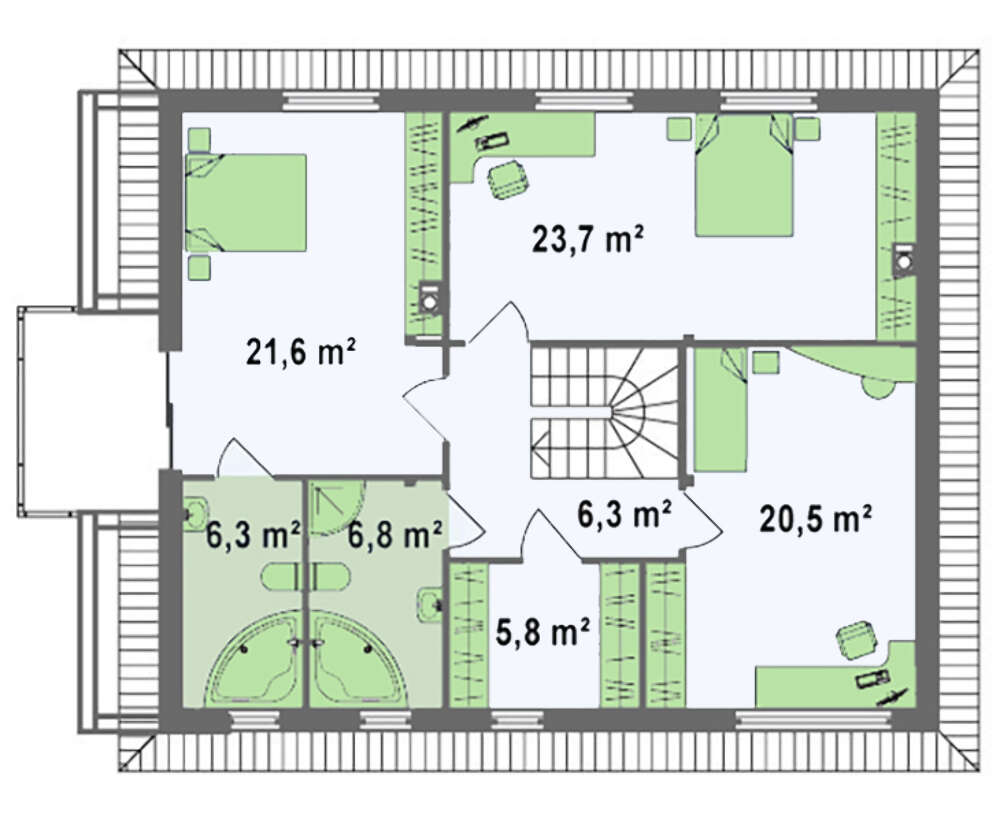 Иное дело — второй этаж. Большие спальни, по размерам равные однокомнатной квартире, помогают организовать качественный отдых. Отдельные апартаменты с собственным санузлом и лаконичным балконом делают его особенно приятным.