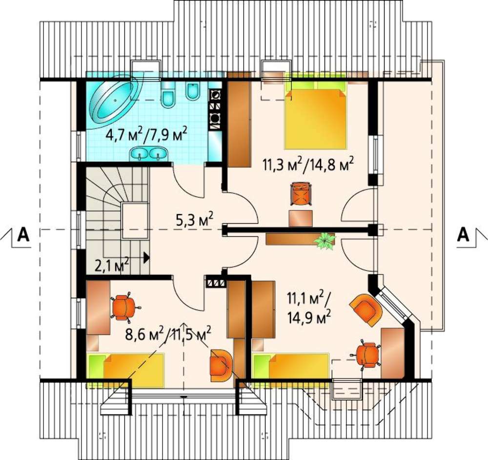 Три уютные и компактные спальни второго этажа имеют в своём распоряжении достаточно места для размещения солидных гардеробов и мебели для индивидуальных апартаментов. Дополнительные удобства получают домочадцы от наличия балкончиков, выходы на которые имеются из двух спален. Романтично настроенные мечтательные особы — такие аппартаменты созданы только для вас.