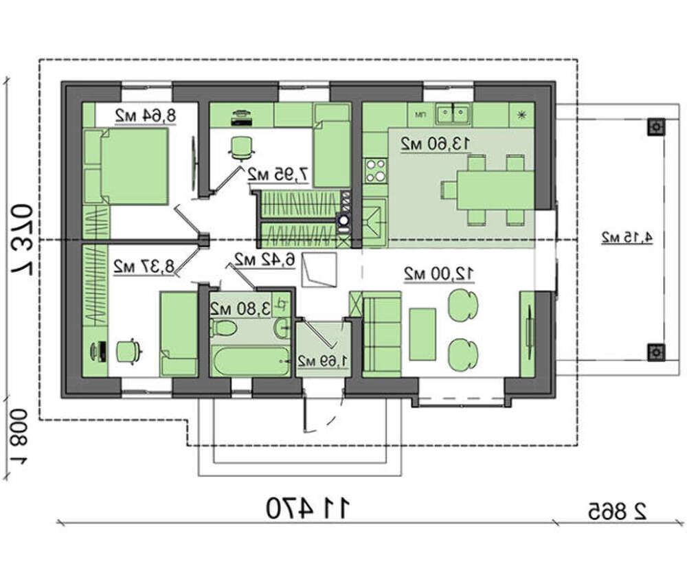Проект содержит три раздела – АрхитектурныйКонструктивный и Инженерный: водоснабжение, отопление, вентиляция, канализация, электроснабжение (приобретается за дополнительную плату) + Пояснительная записка.