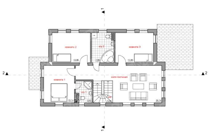 Проект содержит три раздела – Архитектурный, Конструктивный и Инженерный: водоснабжение, отопление, вентиляция, канализация, электроснабжение (приобретается за дополнительную плату) + Пояснительная записка.