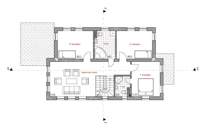 Проект содержит три раздела – АрхитектурныйКонструктивный и Инженерный: водоснабжение, отопление, вентиляция, канализация, электроснабжение (приобретается за дополнительную плату) + Пояснительная записка.