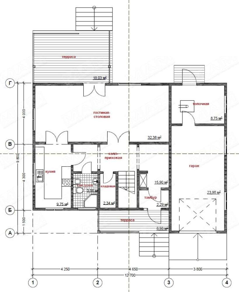 Проект содержит три раздела – АрхитектурныйКонструктивный и Инженерный: водоснабжение, отопление, вентиляция, канализация, электроснабжение (приобретается за дополнительную плату) + Пояснительная записка.