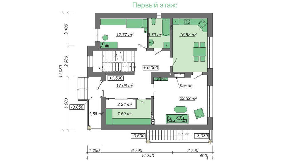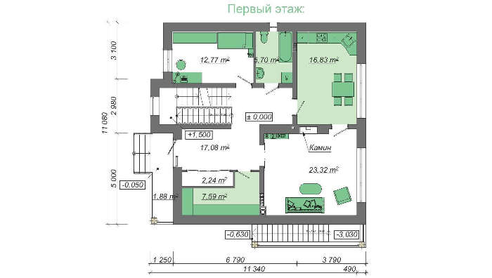 Цокольный этаж позволяет хозяевам экспериментировать и фантазировать. Довольно просторную площадь можно распределить и оборудовать по своему усмотрению, выделив места для отдыха, деловых встреч, оздоровительных процедур.