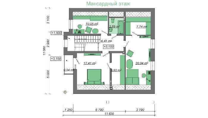Второй этаж включает три личных комнаты, две из которых имеют повышенную комфортностью в связи с наличием индивидуальных гардеробов. Одно из помещений, благодаря личному балкончику, становится особенно привлекательным.