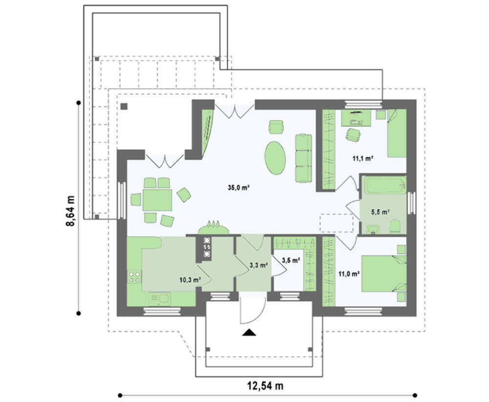Проект содержит три раздела – АрхитектурныйКонструктивный и Инженерный: водоснабжение, отопление, вентиляция, канализация, электроснабжение (приобретается за дополнительную плату) + Пояснительная записка.