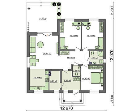 Проект содержит три раздела – Архитектурный, Конструктивный и Инженерный: водоснабжение, отопление, вентиляция, канализация, электроснабжение (приобретается за дополнительную плату) + Пояснительная записка.